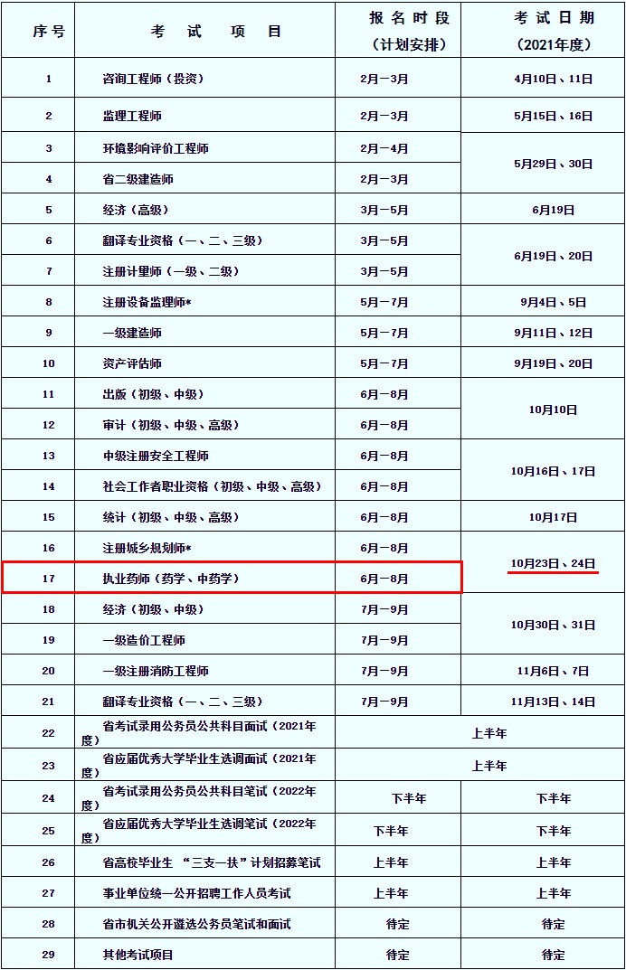 3. 其他考试项目、待定的报名时段和考试日期均以国家、省级人事考试机构下发的文件通知为准。