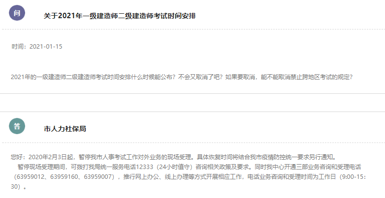 问:2021年的一级建造师二级建造师考试时间安排什么时候能公布?不会又取消了吧?如果要取消,能不能取消禁止跨地区考试的规定?