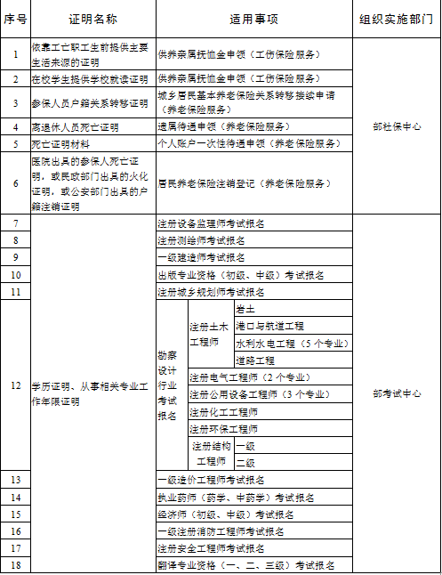 根据现有工作基础,确定在6项社会保险经办业务和12项专业技术人员资格考试报名中开展证明事项告知承诺制试点(详见附件)。
